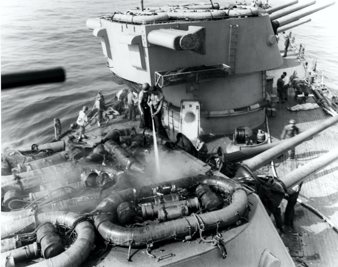 USS Savannah (CL 42) - Crewmen fighting fires in the ship's # 3 six-inch gun turret, after it was hit by a German guided bomb during the Salerno operation, 11 September 1943. Note fully-equipped life rafts stowed atop the turret, and casualties laid out on deck alongside the # 2 turret. Official U.S. Navy Photograph, now in the collections of the National Archives - 80-G-54357 |