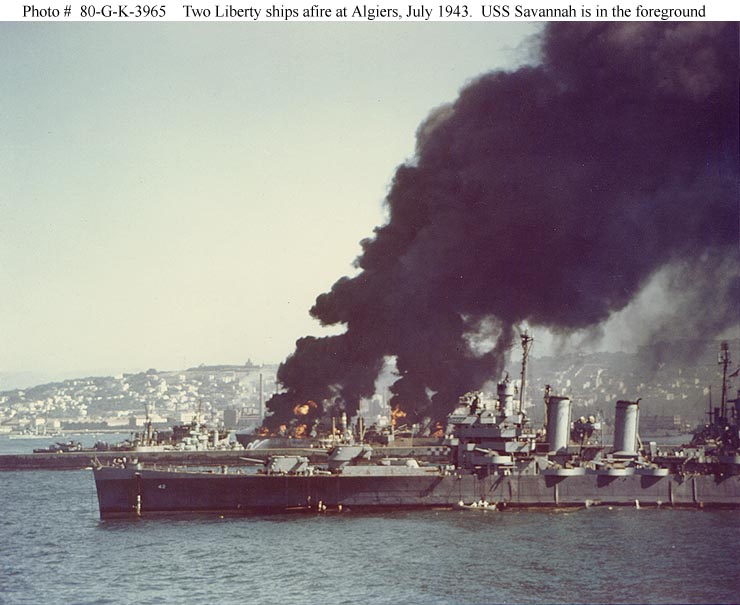 Algiers, Algeria - Two "Liberty" ships afire in Algiers harbor, following a German air attack, 16 July 1943. USS Savannah (CL 42) is in the foreground. Official U.S. Navy Photograph, now in the collections of the National Archives - 80-G-K-3965. |