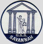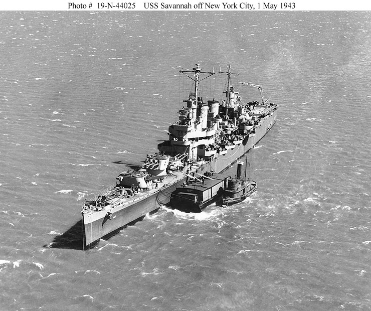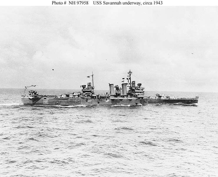 USS Savannah (CL 42) Steaming at sea, circa early 1943. This photograph has been retouched by the wartime censor to remove radar antennas atop her masts and main battery gun directors. However, the radar antennas mounted on her secondary battery gun directors remain visible. Official U.S. Navy Photograph, from the collections of the Naval Historical Center - NH 97958. |