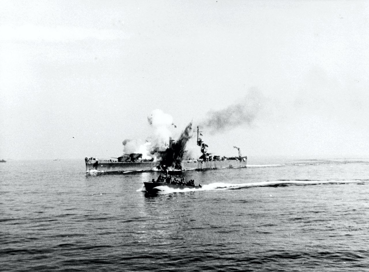 USS Savannah (CL 42) Is hit by a German radio-controlled bomb, while supporting Allied forces ashore during the Salerno operation, 11 September 1943. The bomb hit the top of the ship's number three 6"/47 gun turret and penetrated deep into her hull before exploding. The photograph shows the explosion venting through the top of the turret and also through Savannah's hull below the waterline. A motor torpedo boat (PT) is passing by in the foreground. Courtesy of the Naval Historical Foundation. Collection of Admiral H. Kent Hewett, USN. U.S. Naval Historical Center Photograph NH 95562. |