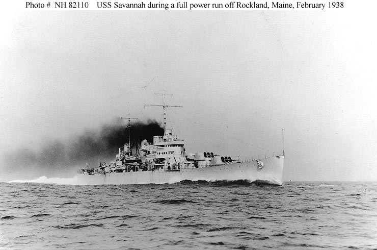 USS Savannah (CL 42) Making a full power run during trials off Rockland, Maine, in February 1938. Courtesy of Captain Church Chappell, USN (Retired), 1975. U.S. Naval Historical Center Photograph - NH 82110 |