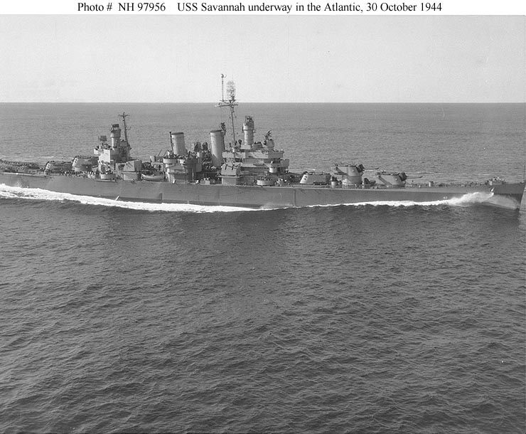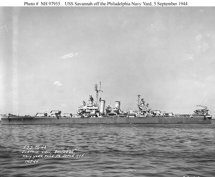 USS Savannah (CL 42) Off the Philadelphia Navy Yard, 5 September 1944, following battle damage repairs and modernization. Official U.S. Navy Photograph, from the collections of the Naval Historical Center - NH 97955. |