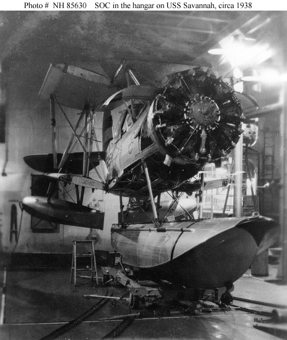 Curtiss SOC-3 scout-observation floatplane Stripped for maintenance in the hangar of USS Savannah (CL 42), circa 1938. The plane's engine is a Pratt & Whitney R-1340 nine-cylinder radial. Courtesy of Louis A. Davison, 1977. U.S. Naval Historical Center Photograph - NH 85630 |