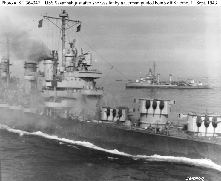 34k | Photo taken 11 September 1943 off Salerno shows Savannah being hit by German FX-1400 radio controlled bomb. | USN | |