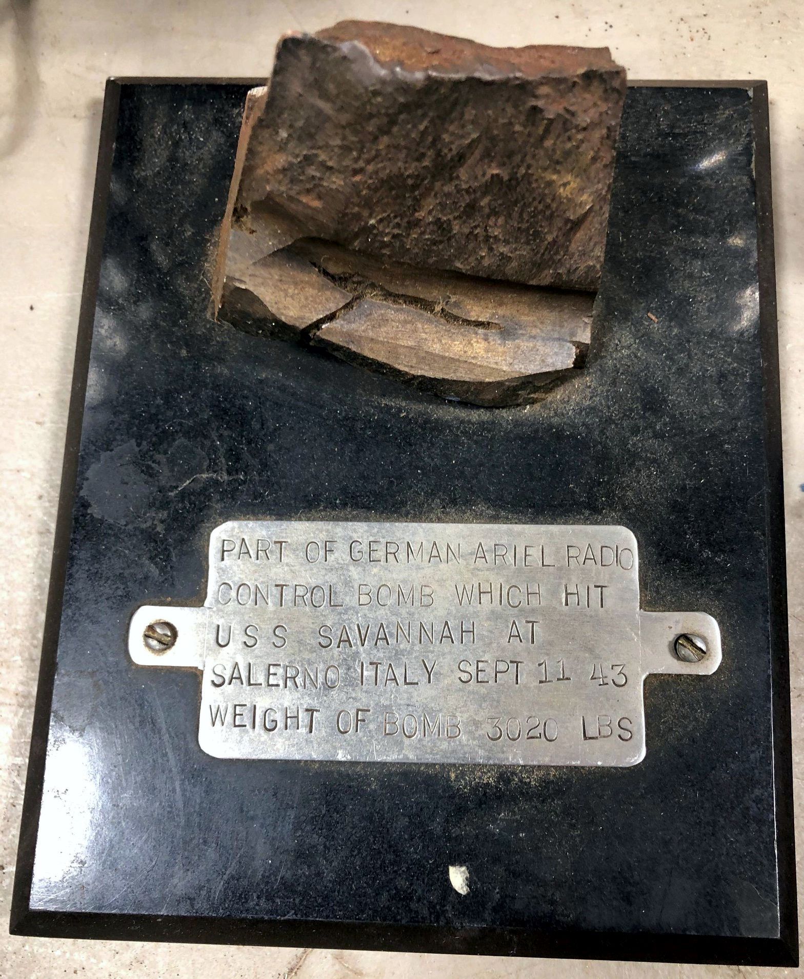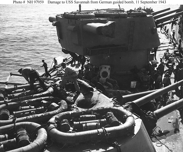 USS Savannah (CL 42) - Bomb penetration hole atop her number three 6"/47 gun turret, while the ship was undergoing initial repairs off Salerno, Italy. She was hit by a German radio-controlled bomb on 11 September 1943, during the Salerno operation. Note life rafts atop the turret, one of which has been cut in two by the bomb. Also note the turret's armored faceplate. View looks forward, with number two 6"/47 gun turret in the immediate background. The original photo caption, released on 2 November 1943, reads (in part): "A round, clean hole marks the point of entry of a Nazi bomb on the cruiser Savannah. Inside, all was chaos, smoke, blood, and death." Official U.S. Navy Photograph, from the collections of the Naval Historical Center - NH 97959 |