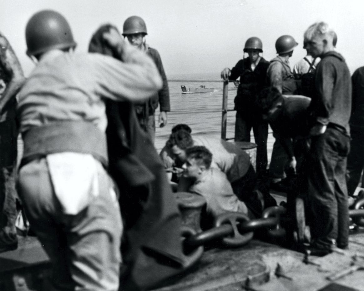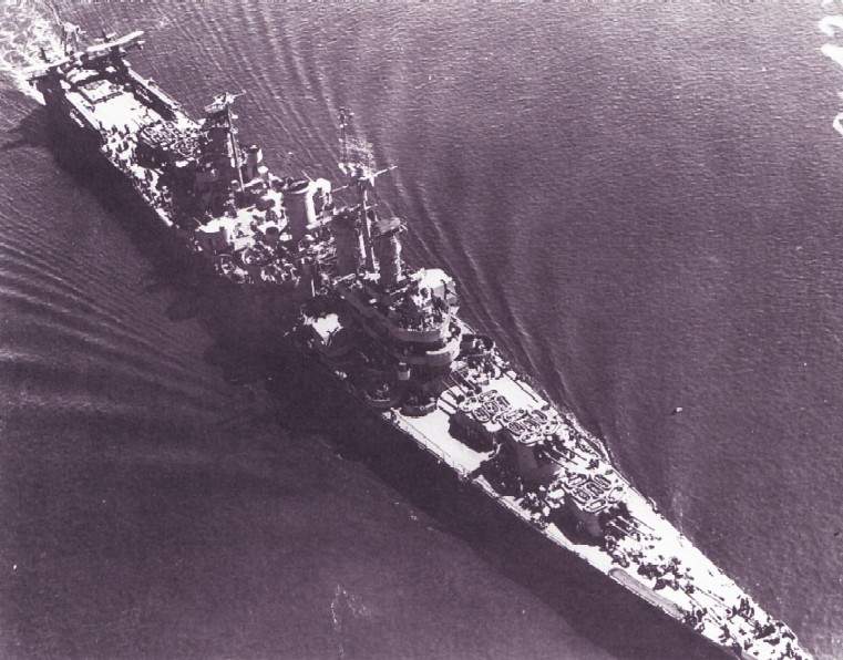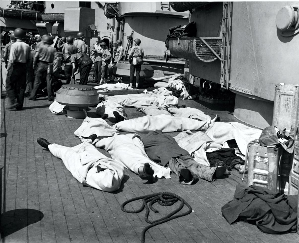 218k | Blankets cover crewmen killed when a German radio-controlled bomb hit the ship's # 3 six-inch gun turret, during the Salerno operation, 11 September 1943. Official U.S. Navy Photograph, now in the collections of the National Archives. |
