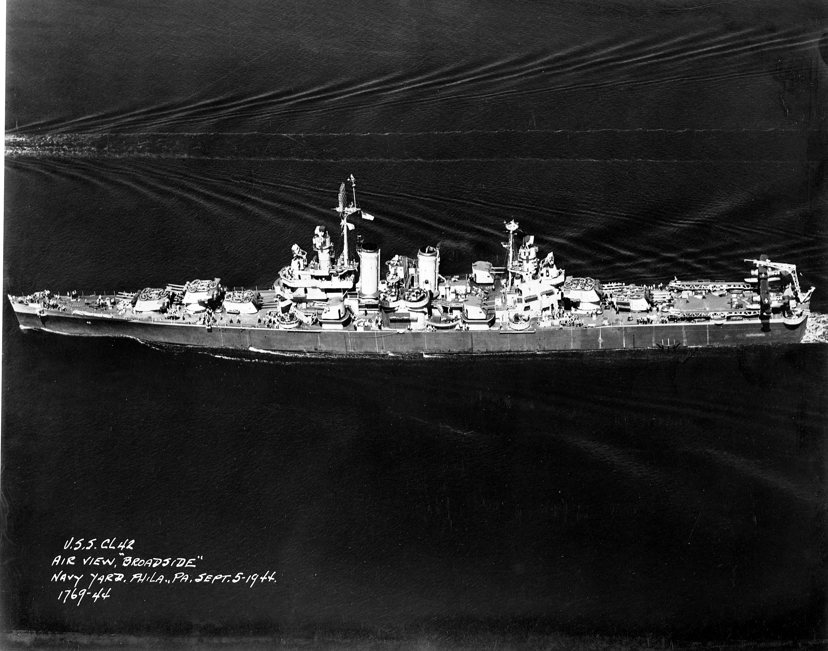 USS Savannah (CL 42) Off the Philadelphia Navy Yard, 5 September 1944, following battle damage repairs and modernization. BuAer photo #179299 |