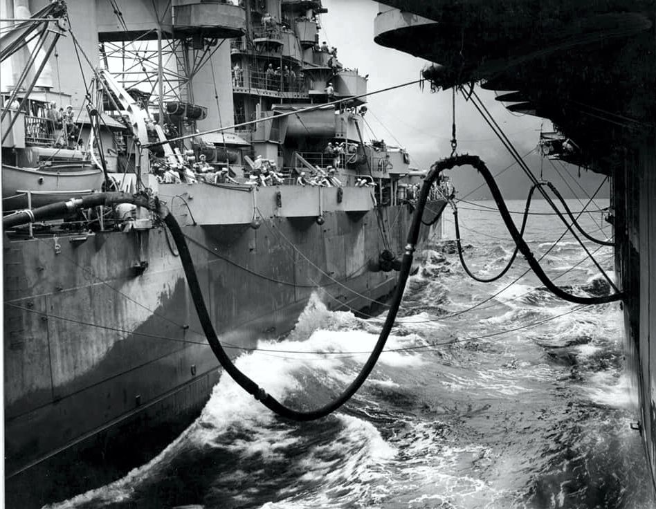 153k | Underway replenishment, USS Savannah (CL 42) from USS Santee (CVE 29), very close, looking forward. March, 1943. | Joe Rossano | |