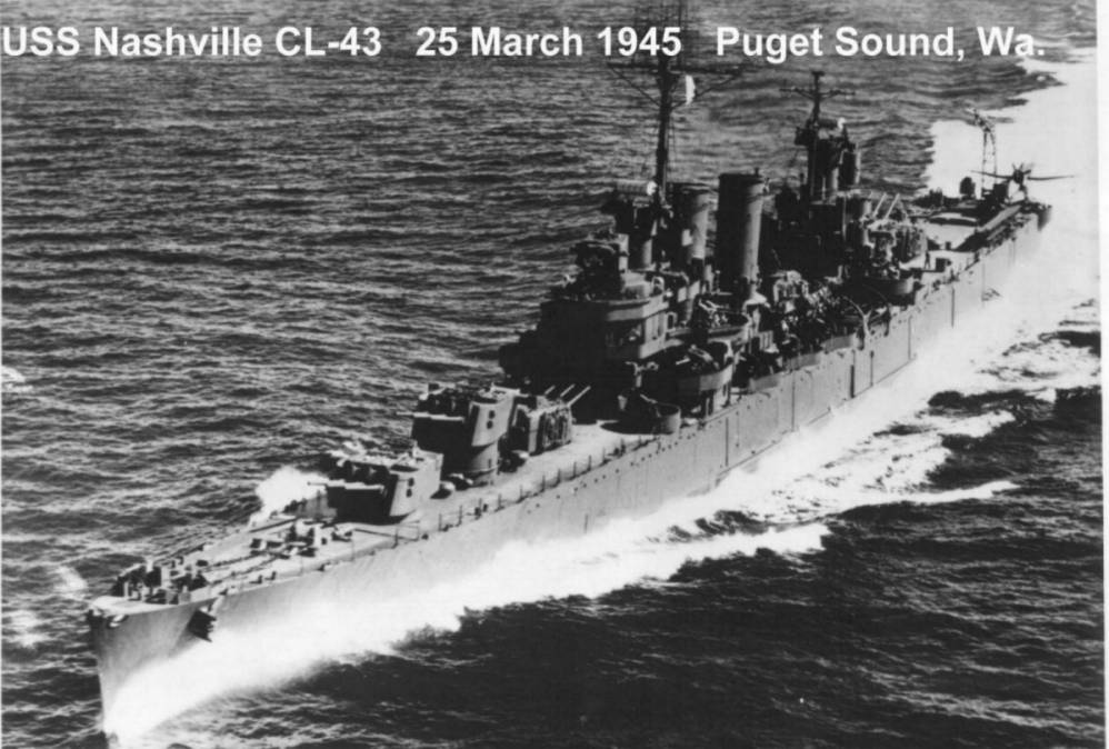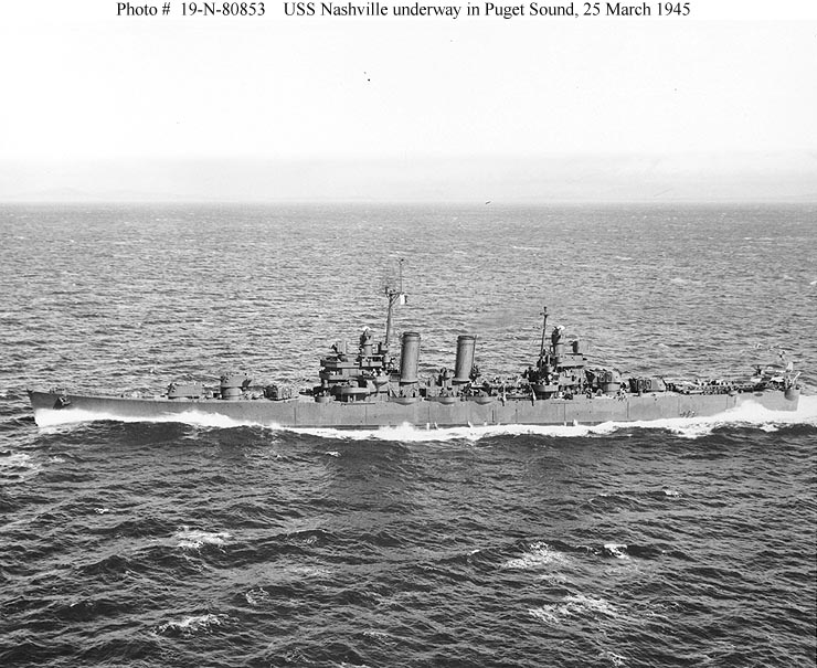 USS Nashville (CL 43) Underway in Puget Sound, Washington, on 25 March 1945. Photograph from the Bureau of Ships Collection in the U.S. National Archives - 19-N-80853 |