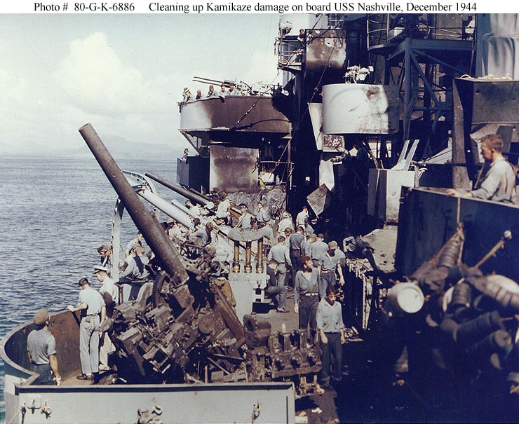 USS Nashville (CL 43) crewmen cleaning up the port side 5"/25 gun battery, after the ship was hit in that area by a Kamikaze on 13 December 1944, while en route to the Mindoro invasion. Note fire damage to the guns and nearby structure. Official U.S. Navy Photograph, now in the collections of the National Archives - 80-G-K-6886. |