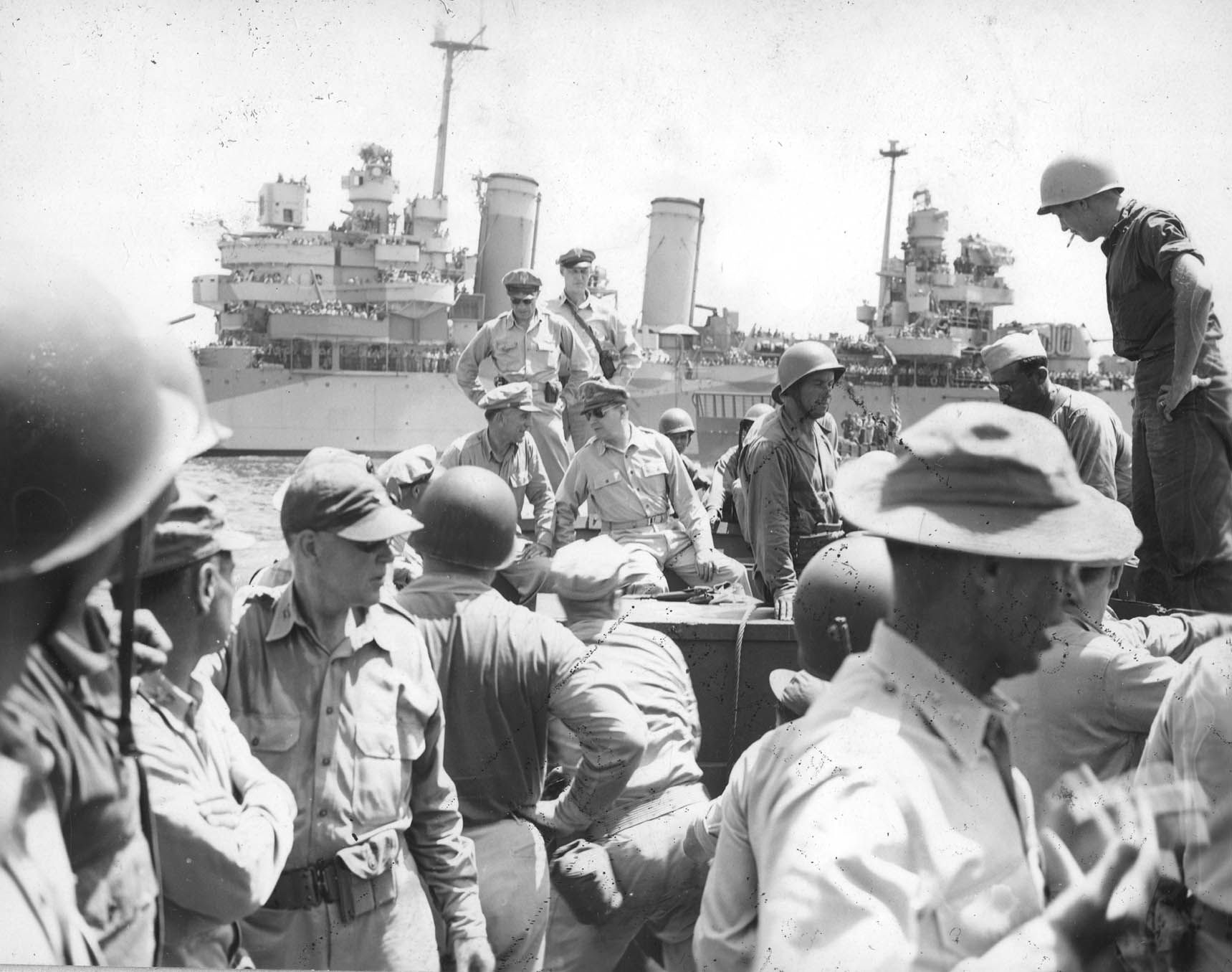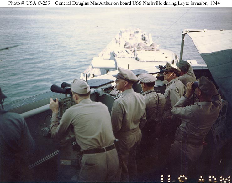 Army General Douglas MacArthur and his staff leave Nashville via LCM on 20 October 1944 for his triumphant return to the Philippine Islands roughly two and a half years after he was evacuated during the Japanese invasion. Shortly after this photo was taken MacArthur waded ashore and gave his famous "People of the Philippines: I have returned" speech via a portable radio ashore before returning to the ship. US Navy photo #80-G-289536 now in the custody of the US National Archives, College Park, Maryland. |