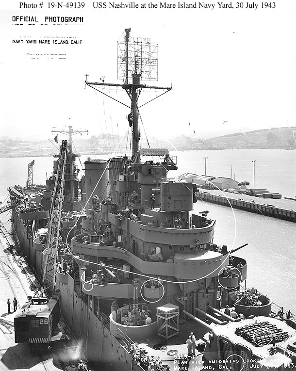 USS Nashville (CL 43) - Plan view amidships, looking aft along the starboard side, with the ship's forward superstructure emphasized. Taken at the Mare Island Navy Yard, California, on 30 July 1943. Note the Mark 33 (lower, with rear toward the camera) and Mark 34 gun directors, with the antenna of a Mark 8 fire control radar atop the Mk. 34; antenna for a SK-1 search radar atop the foremast; lightly armored conning tower at the front of the bridge; floater nets atop the number three 6"/47 triple gun turret; and shipyard railway crane on the pier. Circled areas have recently received modifications. Photograph from the Bureau of Ships Collection in the U.S. National Archives - 19-N-49139 |
