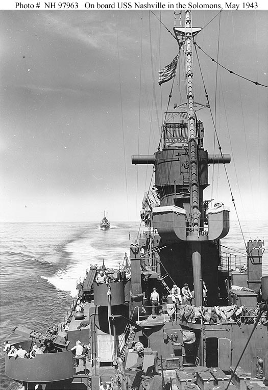 USS Nashville (CL 43) - View on board the ship, looking aft from amidships on the starboard side. Taken on 11-13 May 1943, before or just after Task Force 18's 13 May bombardment of Japanese positions on Kolombangara and New Georgia islands. The ship immediately astern is USS St. Louis (CL 49). Note details of Nashville's after superstructure, main battery gun director, and the 1.1-inch quad anti-aircraft machine gun mount at left. Official U.S. Navy Photograph, from the collections of the Naval Historical Center - NH 97963 |