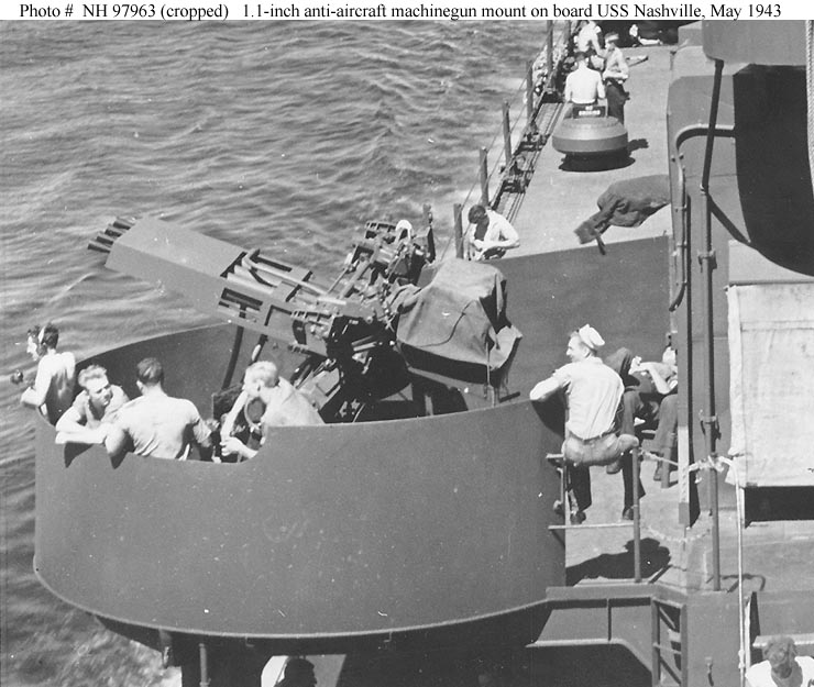 1.1-inch quad anti-aircraft machinegun mounting Located on the starboard side amidships of USS Nashville (CL 43). Photographed 11-13 May 1943, before or just after the 13 May bombardment of Japanese positions on Kolombangara and New Georgia islands. Note the metal shroud installed around the barrels of this gun mount. Official U.S. Navy Photograph, from the collections of the Naval Historical Center - NH 97963 (cropped). |
