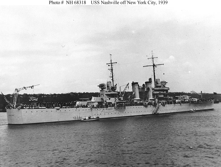 USS Nashville (CL 43) In the Hudson River, off New York City, in 1939. The Palisade Amusement Park is in the right distance. Courtesy of Donald M. McPherson, 1969. U.S. Naval Historical Center Photograph - NH 68318 |