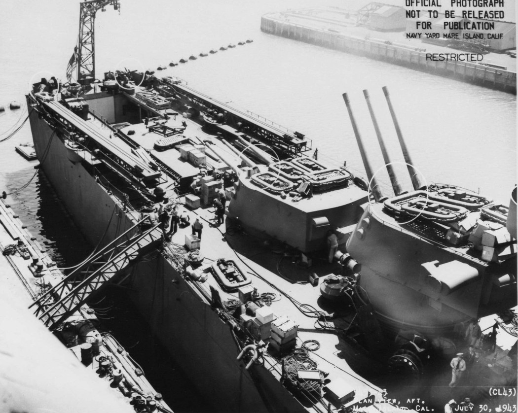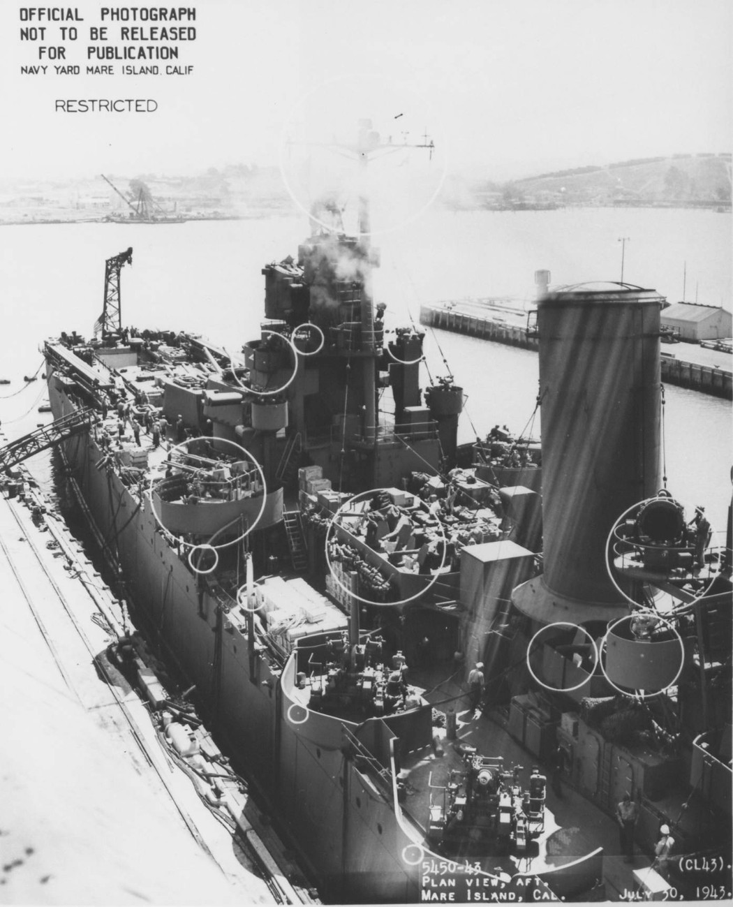 Plan view amidships looking aft of the USS Nashville (CL 43) at Mare Island on 30 July 1943. U.S. Navy Photo #5450-43. |