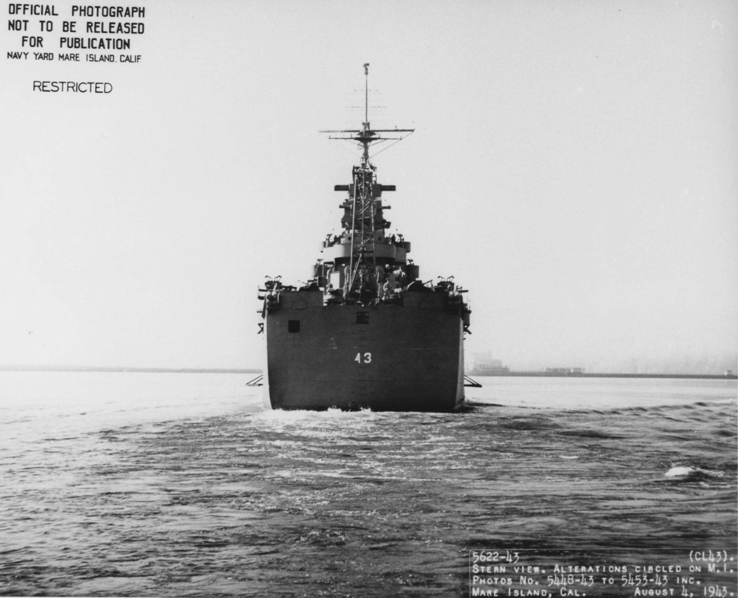 Stern view of the USS Nashville (CL 43) departing Mare Island on 4 August 1943. U.S. Navy Photo #5622-43 |