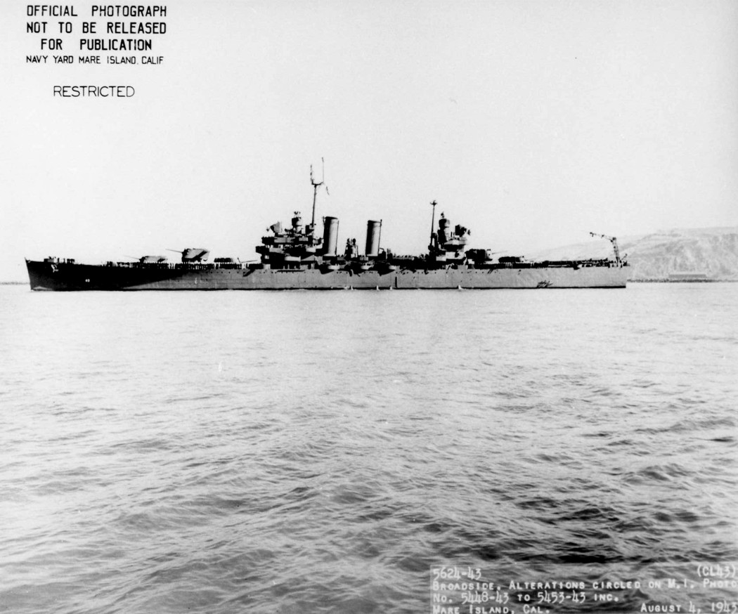 Broadside view of the USS Nashville (CL 43) off Mare Island on 4 August 1943. She was in overhaul at the shipyard from 4 June until 7 August 1943. U.S. Navy Photo #5624-43. |