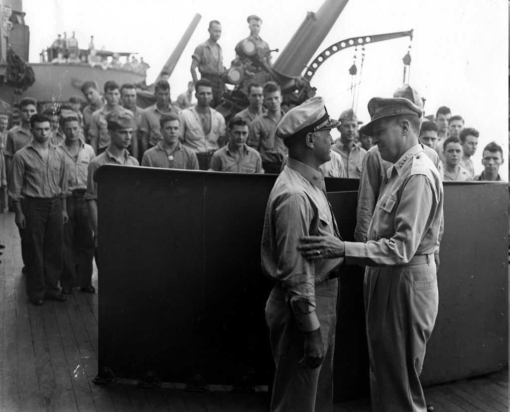Islands in October 1944. To the right of MacArthur is CDR Thomas Corwin, Nashville's Executive Officer. The name of the gentleman shaking MacArthur's hand is unknown.
