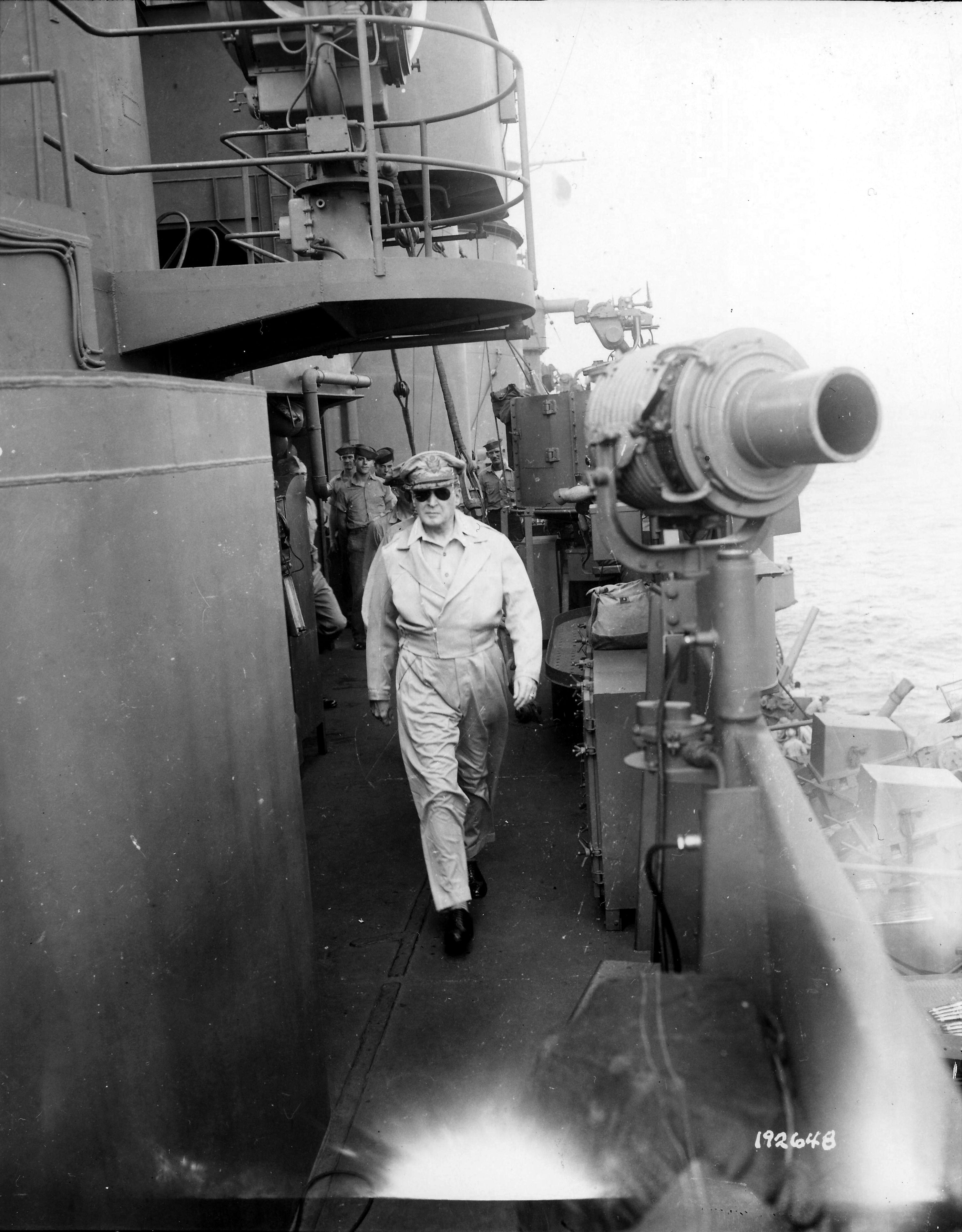 Caption reads: "SC192648 General Douglas MacArthur walks to the bridge on one of the cruisers of the invasion fleet. Southwest Pacific Area. 22 April 1944. USS Nashville" |