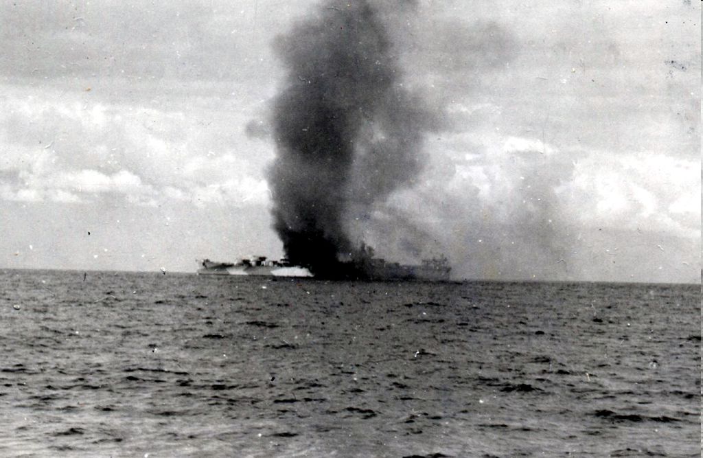 95k | Another photo just after being hit by a Kamikaze on 13 December 1944 off Mindoro. | Ron Reeves |