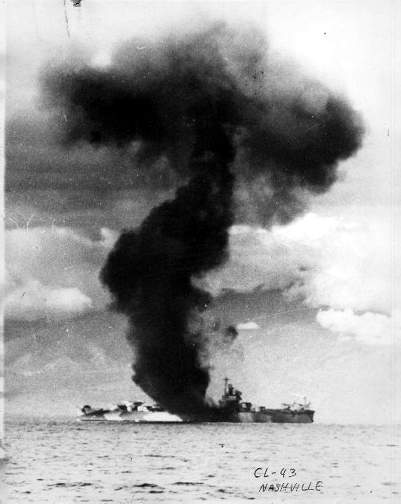 120k | USS Nashville off Mindoro, 13 December 1944. Smoke pall from the kamikaze hit is still lingering. National Archives photo #80-G-294526. |