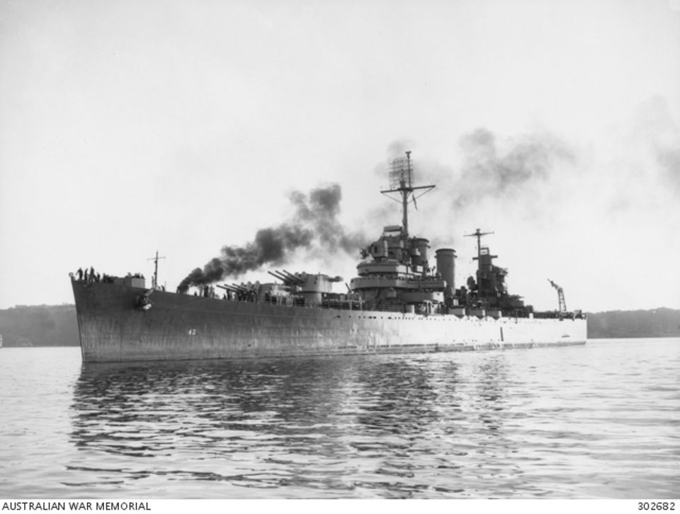 79k | Undated late WW2 port bow photo of the USS Nashville (CL-43) off Sydney, NSW, Australia. Main deck mounted secondary guns 5”/25 gun tubs and her rebuilt bridge is distinctive from her original configuration. Australian War Memorial, Photo No.3302682 |