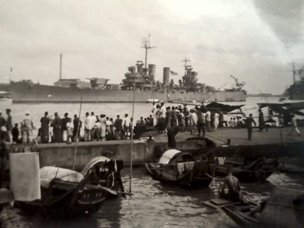266k | USS Nashville (CL 43), October 1945, on Yangtze River Patrol, Whang-poo River, Shanghai, China, view from Whang-poo Pier, USS Rocky Mount (AGC 3) to the right. | Robert Hurst |