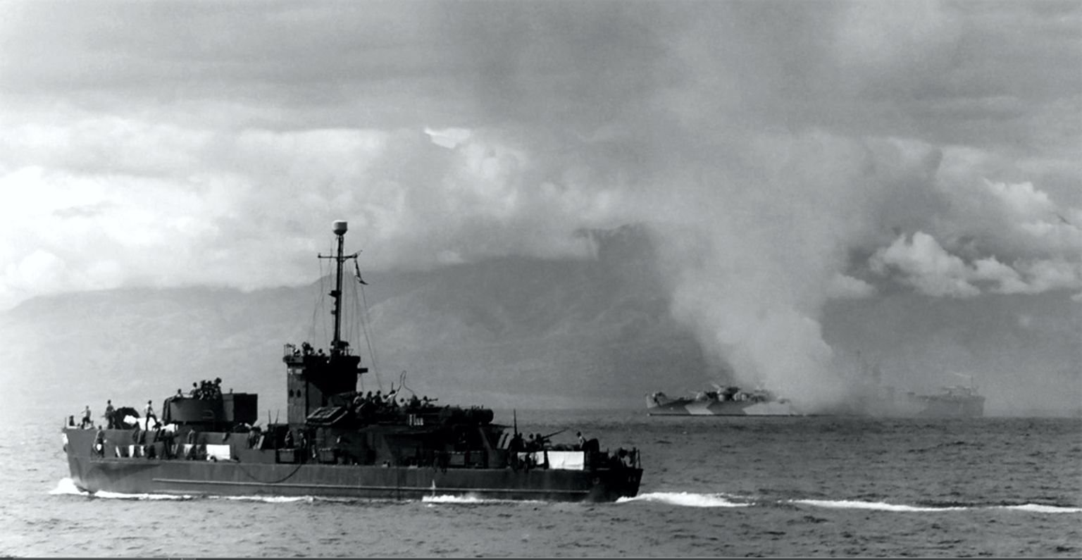 Smoke from fire aboard USS Nashville, seen in the distance shortly after being damaged in combat off Mindoro, 13 December 1944. NA USA Signal Corps 260126. |