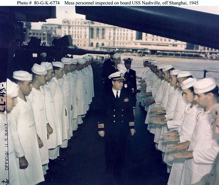 106k | The Supply Officer inspects Mess personnel while anchored in Shanghai, China sometime between 19 September an 17 November 1945. NHHC Photo # 80-G-K-6744 |