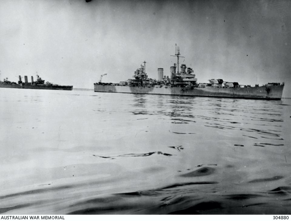 83k | Admiralty Islands. circa 1944. Starboard side view of two cruisers of Task Force 74, HMAS Australia (left) and USS Nashville. Note the difference in Camouflage schemes, Australia's an overall dark grey, probably G 10, and the American cruiser in Measure 32/21D. Australian War Memorial, Photo #304880 |