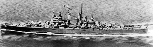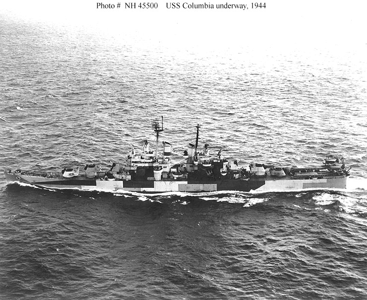 Portside view while underway in 1944. Note the Measure 32 Design 3D camouflage pattern. Also, photo caption misidentifies the ship as Columbia. Proper identification provided by Richard Jenson. Official U.S. Navy Photograph #45500, from the Collections of the Naval History and Heritage Command. |