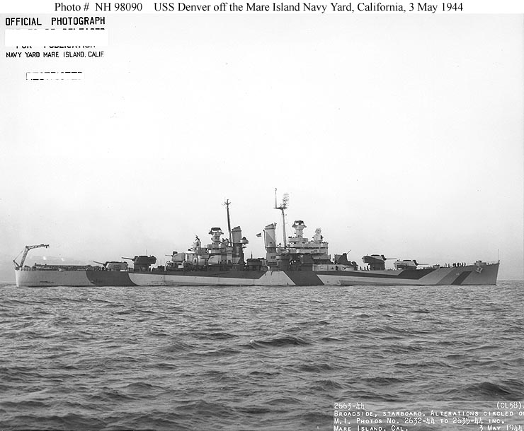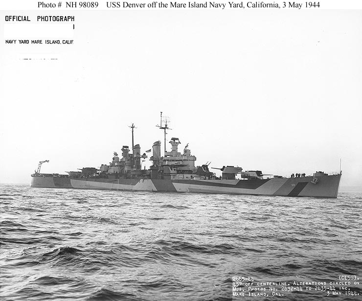 USS Denver (CL 58) Off the Mare Island Navy Yard, California, following an overhaul, 3 May 1944. She is painted in camouflage Measure 33, Design 3d. Official U.S. Navy Photograph, from the Collections of the Naval Historical Center #NH 98089. |