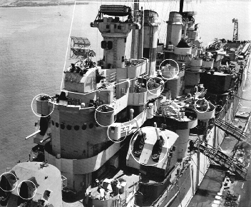 USS Denver (CL 58) Photographed from a crane at the Mare Island Navy Yard, California, following overhaul, 1 May 1944. This view looks aft along the port side, with Denver's forward superstructure in the foreground. Circles mark recent alterations to the ship. Note gun directors: a Mark 37 with antenna for a Mark 4 radar on top of the pilothouse; with a Mark 34 with antenna for a Mark 8 radar located just in front of the foremast. Official U.S. Navy Photograph, from the Collections of the Naval Historical Center #NH 98094. |
