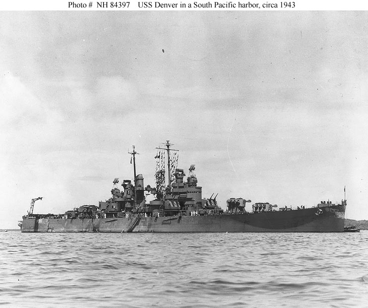 USS Denver (CL 58) In a South Pacific harbor, circa 1943. Note signal flags drying on her foremast halyards. U.S. Naval Historical Center Photograph #NH 84397. |