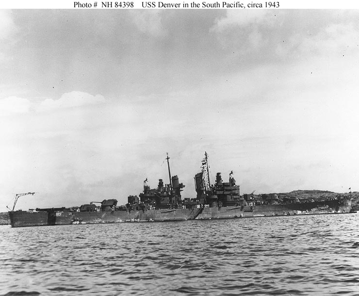 USS Denver (CL 58) In a South Pacific harbor, circa 1943. U.S. Naval Historical Center Photograph #NH 84398. |