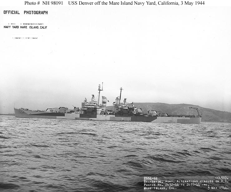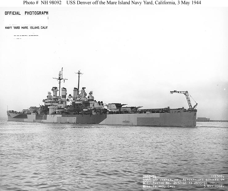 USS Denver (CL 58) Off the Mare Island Navy Yard, California, following an overhaul, 3 May 1944. She is painted in camouflage Measure 33, Design 3d. Official U.S. Navy Photograph, from the Collections of the Naval Historical Center #NH 98091. |