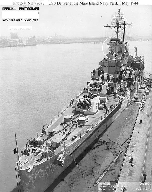 USS Denver (CL 58) Photographed from a crane at the Mare Island Navy Yard, California, following overhaul, 1 May 1944. This view looks aft along the port side, from just off the bow. Circles mark recent alterations to the ship. Denver appears to be flying her Union Jack at half-staff. Note the log and rather dirty water between the ship and the pier. Official U.S. Navy Photograph, from the Collections of the Naval Historical Center #NH 98093. |