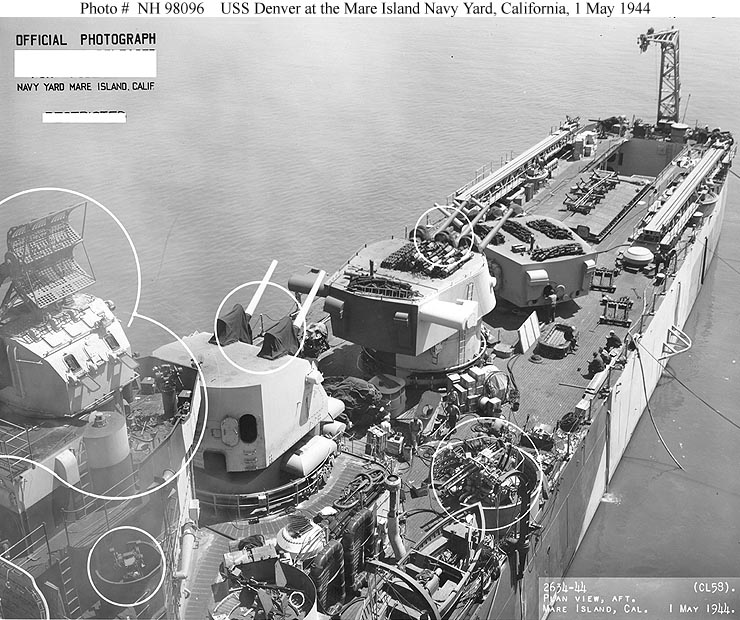 USS Denver (CL 58) Photographed from a crane at the Mare Island Navy Yard, California, following overhaul, 1 May 1944. This view looks aft along the port side, with the ship's after smokestack at left. Circles mark recent alterations to the ship. Note gratings around the 20mm gun in lower center; spare 40mm gun barrels on the deck beside the 40mm quad gun mounting in lower left; Mark 34 Gun Director with antenna for a Mark 8 radar and Mark 37 Gun Director with antenna for a Mark 4 radar atop the after superstructure. Official U.S. Navy Photograph, from the Collections of the Naval Historical Center #NH 98095. |