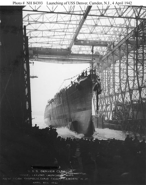 USS Denver (CL 58) Sliding into the water, during her launching at the New York Shipbuilding Corporation shipyard, Camden, New Jersey, on 4 April 1942. U.S. Naval Historical Center Photograph #NH 84393. |