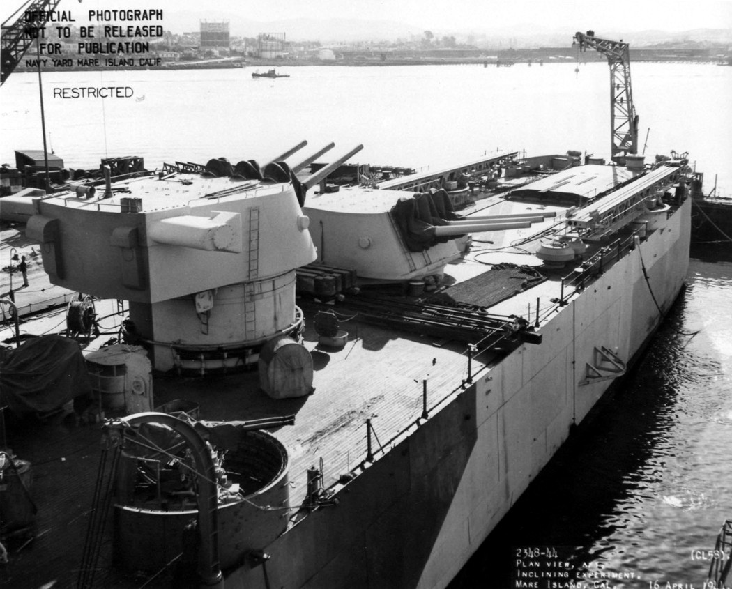 Aft plan view of USS Denver (CL 58) in Mare Island's dry dock #3 on 16 April 1944. She is under going an inclining experiment as indicated by the device between turrets 3 & 4. U.S. Navy photo #2348-44. |