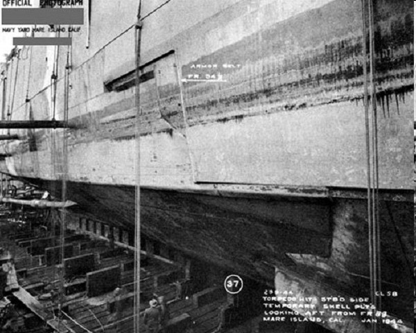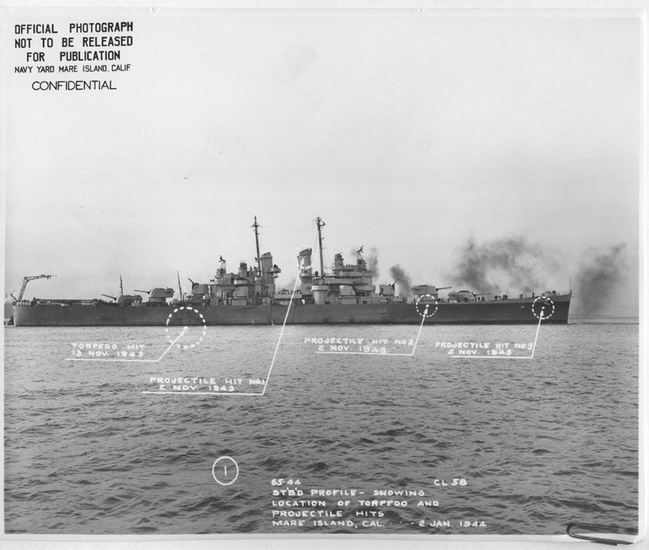 Starboard side photo showing locations of three 8 inch shell impacts (which did not explode) that were received on 1/2 November 1943 and one aerial torpedo hit which occurred on 13 November 1943. Photo taken on 02 Jan 1944 off Mare Island. NARA San Francisco, Mare Island Naval Shipyard General Correspondence Files, 1939-47 |