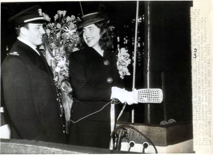 Caption: "CAMDEN, N.J., April 4--READY...AIM...Lois Jane Stapleton, 16, gets firing instructions from her brother, Ensign Ben F. Stapleton, Jr., as she prepares to christen the new cruiser Denver today. Both are children of Denver's mayor and Mrs. Ben Stapleton. (AP WIREPHOTO)..." |