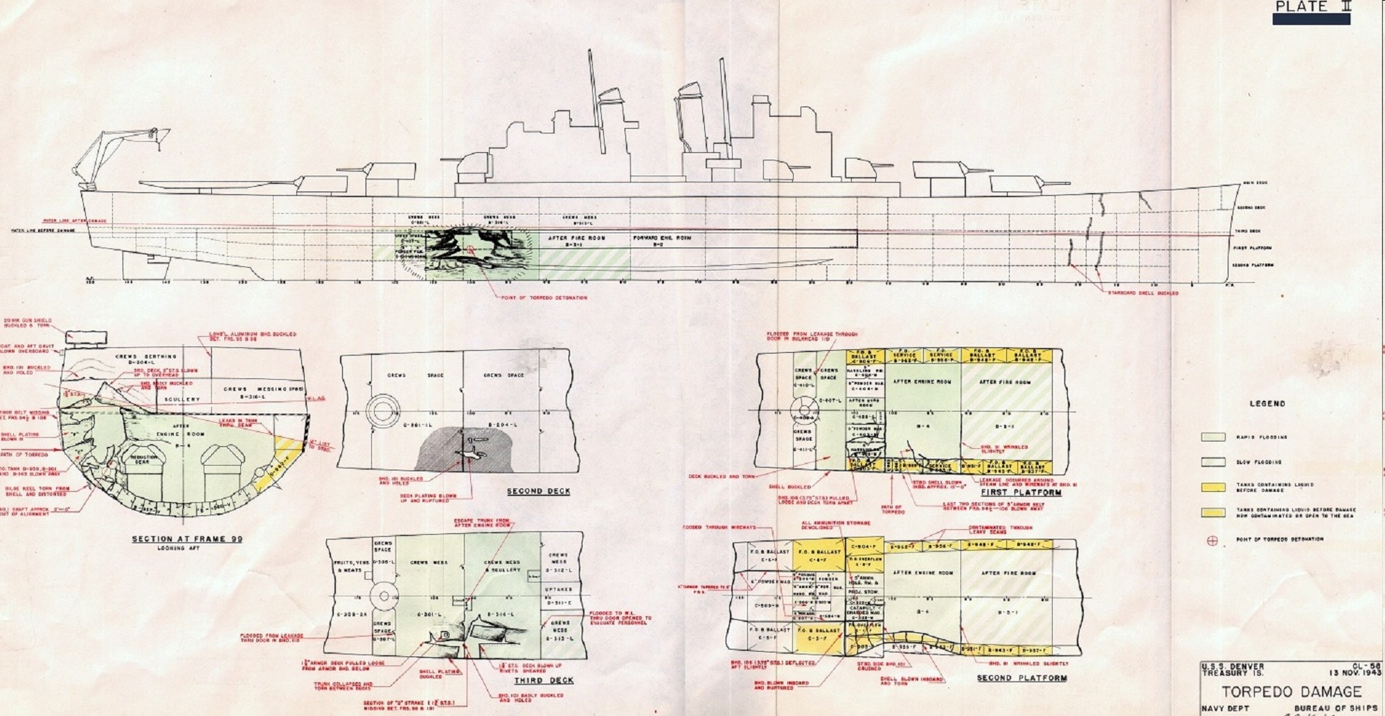 Torpedo damage diagram for the USS Denver (CL-58) occurring on November 13, 1943 off Treasury Islands. Navy Department Library, War Damage Report No.53, USS Denver (CL58) Torpedo Damage Treasury Islands November 13, 1943 |