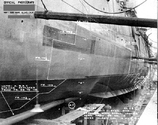 Permanent shell plating repair of torpedo damage on the USS Denver (CL 58), as seen at Mare Island Navy Yard on 16 March 1944. Navy Department Library, War Damage Report No.53, USS Denver (CL58) Torpedo Damage Treasury Islands November 13, 1943 |