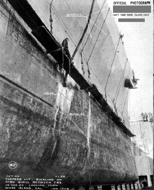 Starboard side shell buckling on the USS Denver (CL 58), as seen in January, 1944 at Mare Island Navy Yard. This buckling is aft looking forward from where the torpedo struck the ship. Navy Department Library, War Damage Report No.53, USS Denver (CL58) Torpedo Damage Treasury Islands November 13, 1943 |