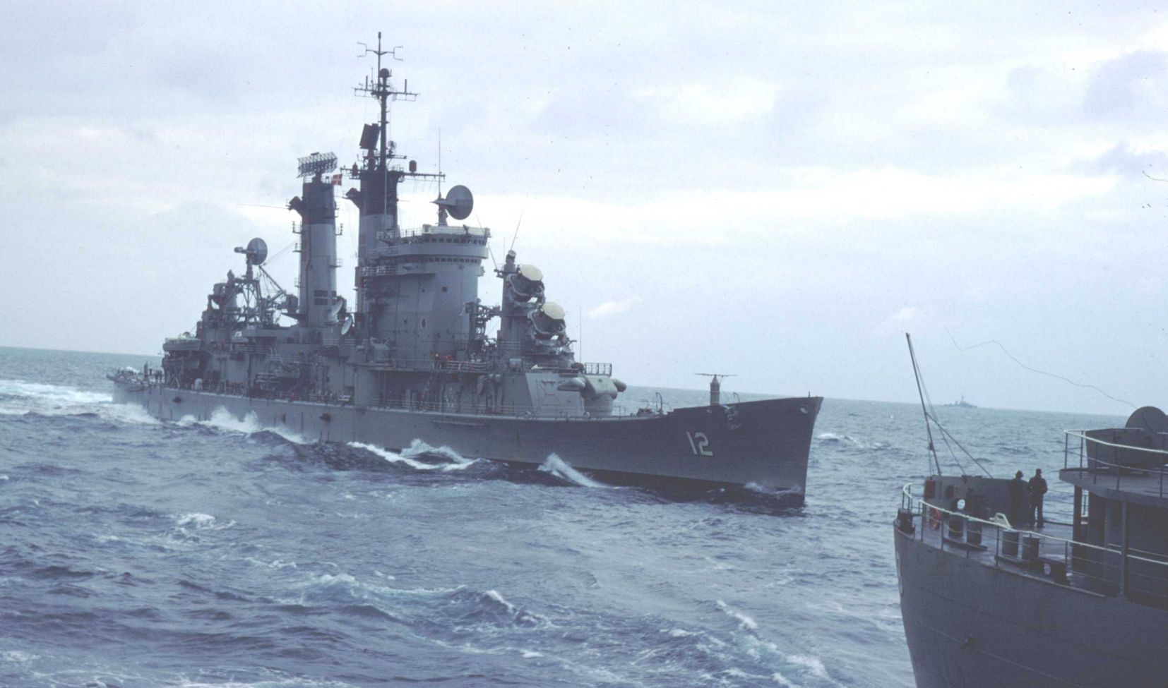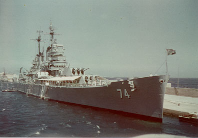 USS Columbus (CG 12) Underway in the Mediterranean Sea, during her last Sixth Fleet cruise, 1974. This photograph was received from the ship's Executive Officer in December 1974. Official U.S. Navy Photograph, from the collections of the Naval Historical Center #NH 81595. |