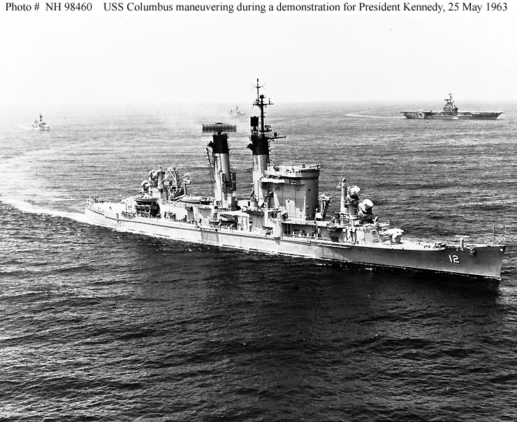 USS Columbus (CG 12) Maneuvering during a readiness demonstration by Task Force 10 for President John F. Kennedy on 25 May 1963. The President was then embarked on USS Kitty Hawk (CVA 63), operating in the eastern Pacific. Photographed by PHC R.W. Smith, of USS Kitty Hawk. Official U.S. Navy Photograph, from the collections of the Naval Historical Center #NH 98460. |