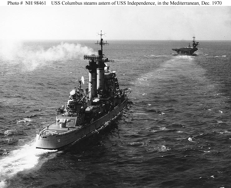 USS Columbus (CG 12) Steams astern of USS Independence (CVA 62), while operating in the Mediterranean Sea with Task Group 60.2, December 1970. Photographed by PH3 J. Rose, of USS Independence. Official U.S. Navy Photograph, from the collections of the Naval Historical Center #NH 98461. |