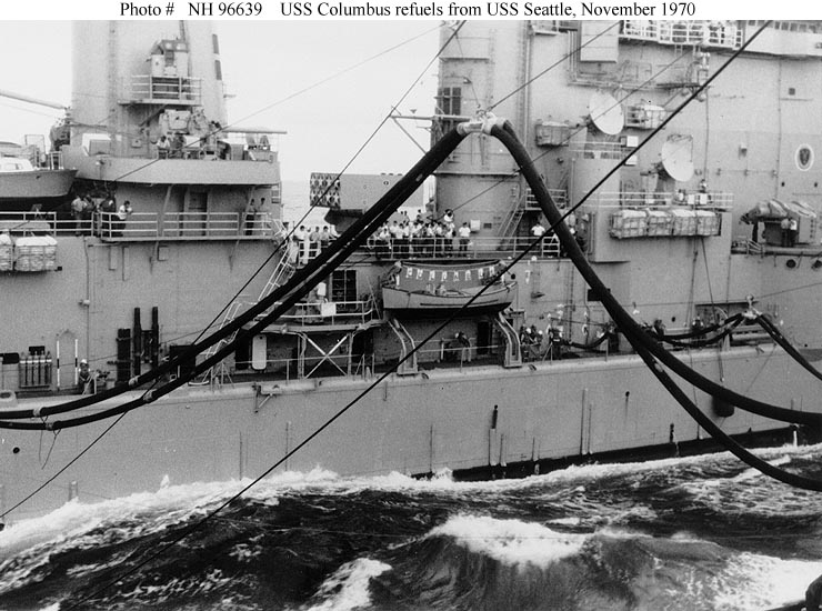 USS Columbus (CG 12) Refueling from USS Seattle (AOE 3), November 1970. Note Columbus' name spelled out on a line above the 26-foot motor whaleboat, amidships, with the ship's band playing on the deck above. Official U.S. Navy Photograph, from the collections of the Naval Historical Center #NH 96639. |